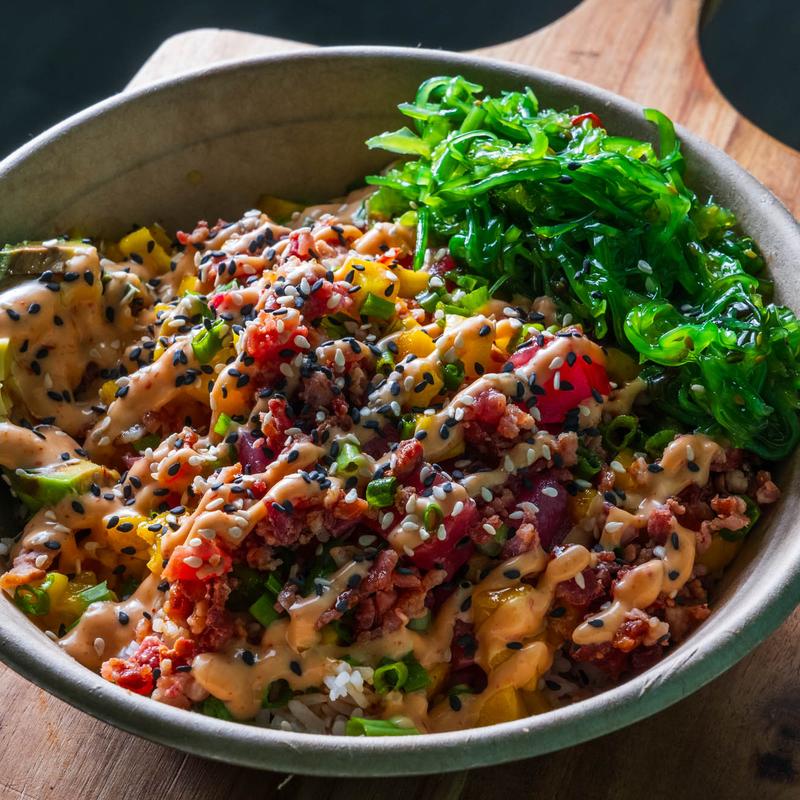 Your choice of base, protein topped with scallions, crispy bacon, mango, and avocado. Drizzled with house-made spicy mayo and sprinkled with sesame seeds.